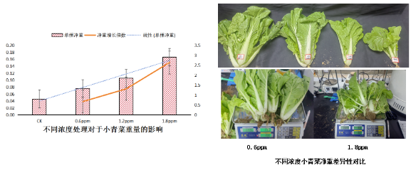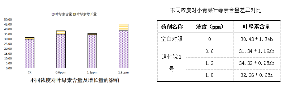 后期喷施不同浓度的通化院1号可提高小青菜单棵重,单棵重量分别增重0.6倍、1.3倍和2.6倍,对提高小青菜产量有显著效果,低浓度即可有显著效果。