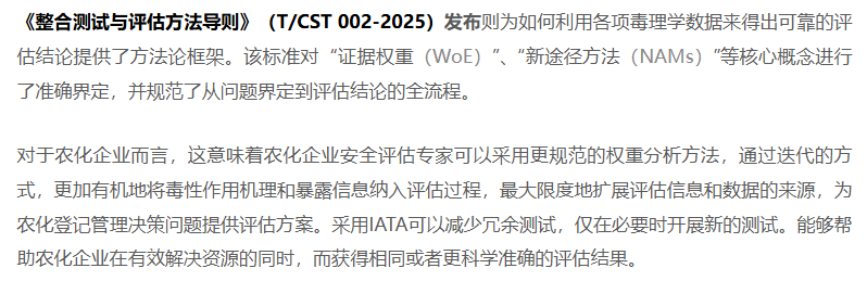 近日,中国毒理学会(CST)正式发布并实施了《毒理学关注阈值方法指南》(T/CST 001-2025)与《整合测试与评估方法导则》(T/CST 002-2025)两项团体标准。《毒理学关注阈值方法指南》在国内首次系统性地介绍了TTC方法在农药领域的应用,明确了农药杂质、代谢物及降解产物的安全性评估路径,填补了该领域的标准空白。
