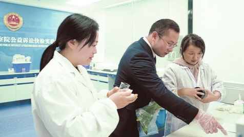 4月12日,湖北省恩施市检察院开展食品安全快检专项行动,依托公益诉讼快检实验室,对辖区农贸市场在售蔬菜进行农药残留抽检。检察官和检测中心工作人员运用食品安全综合分析仪进行检测,检测项目包括亚硝酸盐检测、有机磷和氨基甲酸酯类农药残留检测等。