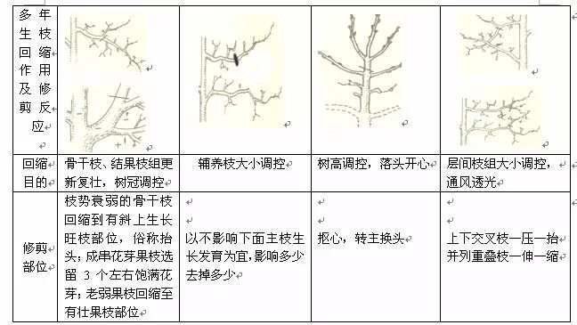 (3)回缩:指对多年生枝的短截,又称缩减。用于辅养枝、结果枝组。回缩能减少枝干总长度,使养分和水分集中供应保留下来的枝条,促进下部枝条的生长,对复壮树势较为有利。其作用在于改善树冠内光照条件,降低结果部位,改变延长枝的延伸方向和角度,控制树冠,延长结果年限。回缩与短截的不同之处在于剪口位置,一年生枝条被短截后的长势决定于剪口芽的饱满程度,而回缩后的长势决定于剪口枝强弱,剪口枝如留强旺枝,则剪后生长势强,利于更新恢复树势;如果留弱小枝,则生长势弱;若长势中等,则促发小枝,既能生长又能结果。