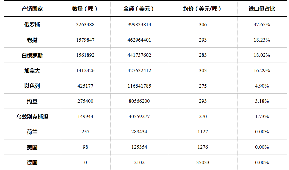 表2025年1—9月中国氯化钾进口量按照产销国统计