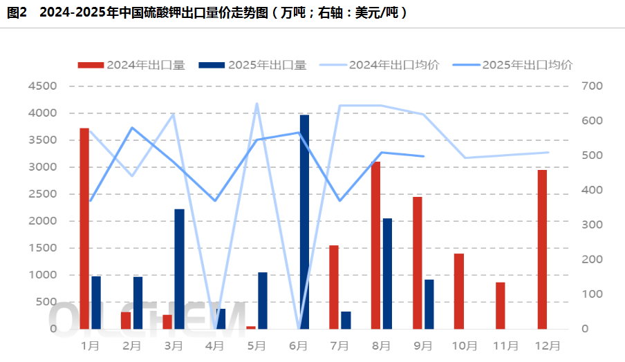 虽然我国氯化钾进口量逐渐恢复,但硫酸钾进出口量增幅缓慢。根据最新的海关数据,2025年9月,我国硫酸钾进口8850吨,较上月环比增加80.10%。2025年1—9月,我国累计进口量为3.02万吨,较去年同期增长71.03%。2025年9月,我国硫酸钾出口917吨,较上月环比减少55.20%。2025年1—9月,我国累计出口量为1.29万吨,较去年同期增长12.23%。