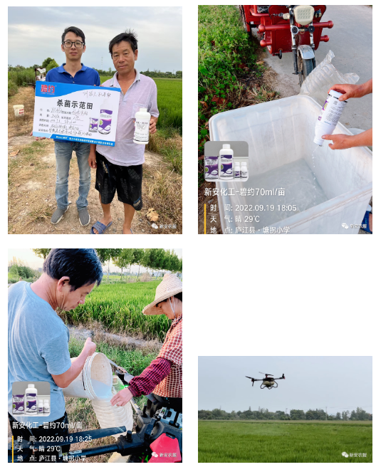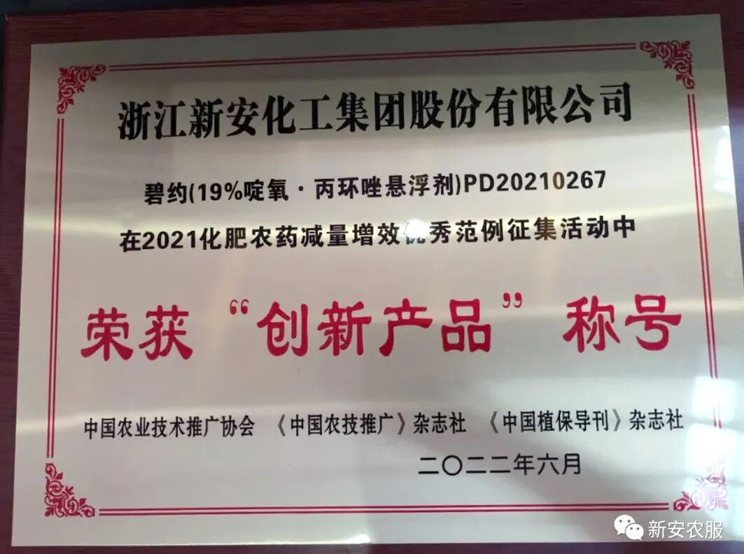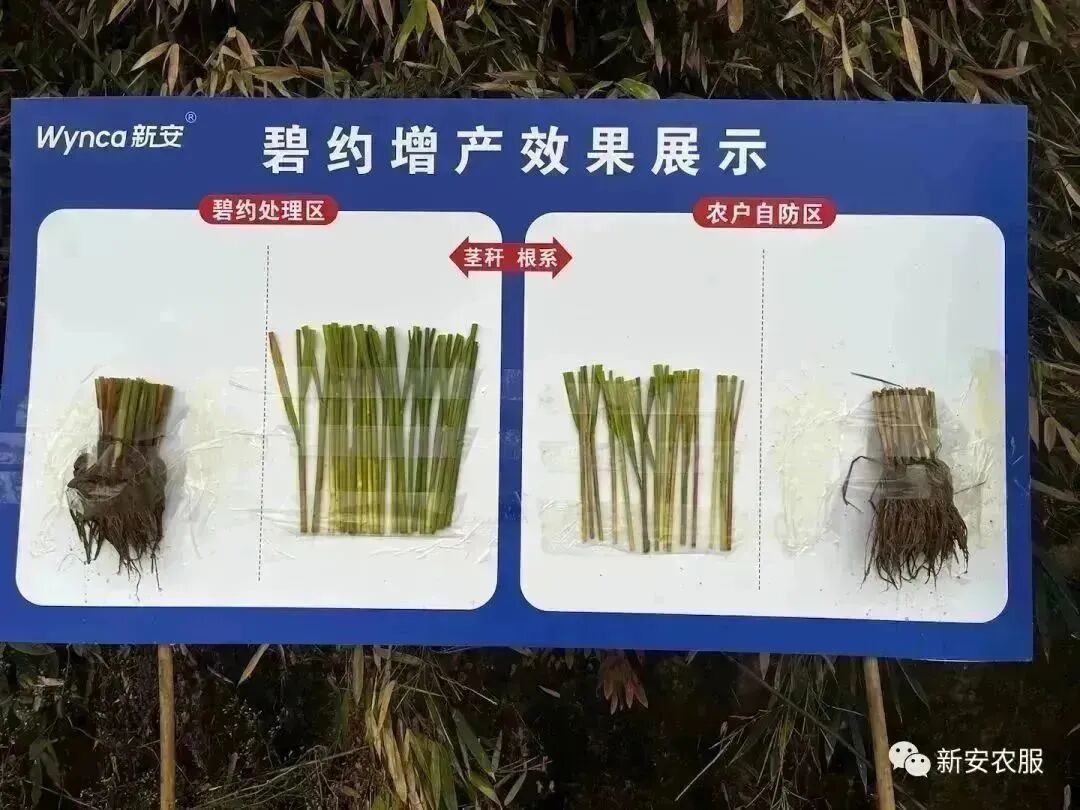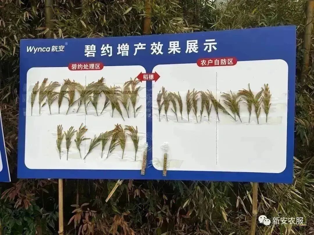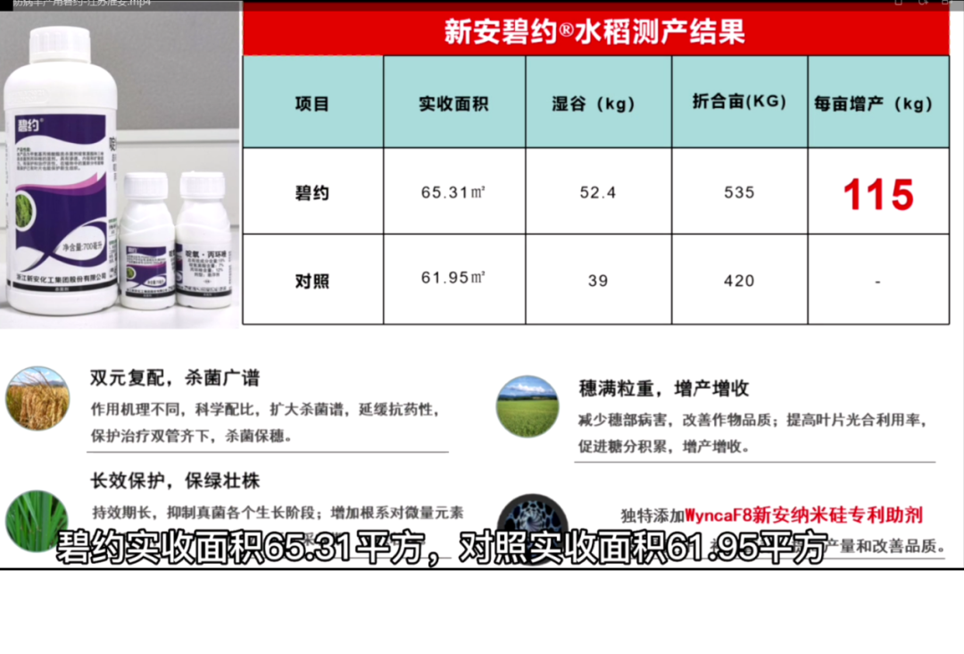 碧约产品介绍 产品:碧约(19%啶氧·丙环唑悬浮剂) 成分含量:7%啶氧菌酯+12%丙环唑 商标:碧约 广告语:防病增产用碧约 包装规格:35ml ×50袋×4盒  70mL×100瓶  700mL×12瓶 用药剂量:推荐用药量为50-70ml/亩 防治时期:水稻破口前7-10天、齐穗期各喷施一次,共施药2次,间隔10-15天 农药登记证号:PD20210267 产品特点 双元复配,杀菌广谱:先进配方,科学配比,扩大杀菌谱,延缓抗药性, 抑制真菌各个生长阶段,保护治疗双管齐下,杀菌保穗。 长效保护,壮株健秆:增加根系对微量元素的利用率,改善作物品质,减少乙烯合成,调控植物内源激素,延长采收期,壮株健秆。 穗满粒重,增产增收:解决因不良环境引起的作物长势不良;提高叶片光合利用率,促进糖分积累,增产增收。 1 新安碧约在江浙落地开花! 试验结果:11月17日下午,经销商伙伴和周边种植大户朋友一同考察碧约示范田,检测了碧约示范田与农户自防区的防效: 细致查看中 与对照比,用碧约后处理无穗部病害、虫害;穗满粒大、品色佳; 与对照比,用碧约后处理叶片更长更宽; 与对照比,用碧约后处理茎秆粗壮、分蘖多; 防效总结:通过碧约示范田与农户自防区水稻考察比对,使用碧约的水稻:1、无穗部病害、虫害,同时明显看出穗满粒大、品色佳;2、叶片更长更宽;3、茎秆粗壮、分蘖多。增产效果明显! 2 新安碧约在安徽落地开花! 试验概况: 试验地点:安徽省庐江县同大镇刘墩村 试验面积:10亩 作物:水稻(糯稻) 防治对象:水稻稻曲、稻瘟等 用量:70ml/亩 试验情况:该区域水稻9月初高温干旱持续影响水稻稻破口、抽穗,9月20日齐穗前后冷空气影响,加之秋后昼夜温差大,雾露重,非常有利于稻瘟病、稻曲病的发生。考虑到环境因素影响病、虫害爆发的可能,通过采用上图以碧约为核心的产品用药方案,在8月25日、9月3日、9月19日,即拔节分蘖期、破口前期、齐穗期的三次用药。 试验结果:10月20日上午,经销商伙伴和周边种植大户朋友一同考察碧约示范田,通过碧约示范田与农户自防区水稻考察比对,碧约方案用药水稻呈现稻株健壮翠绿、无穗部病害、虫害,同时籽粒饱满、品色佳,千粒重测产增产6.5%。 3 新安碧约在江苏落地开花! 试验结果: 2022年10月30日在江苏淮安水稻测产测产结果(湿谷),碧约区535Kg/亩,增产115Kg/亩。 4 新安碧约在山东落地开花! 2022年12月20日晚,由新安集团营销四部举办的“新安集团山东区域碧约产品交流会”会议,在腾讯会议APP以线上形式成功召开。 新安市场应用技术中心的副总经理刘韬为客户带来全球农药发展趋势和新安在农药制剂领域未来的布局,病清晰讲解了新安杀虫杀菌剂新证件的引进和下证进度。 新安农化营销中心山东市场负责人连恒陶讲解碧约防病增产方案的推广方向及田间应用技术。新安集团用科学植保方案,引领防病增产新方向,为中国粮食丰收贡献力量。 会议还邀请到2位嘉宾客户,进行了碧约防病增产方案田间使用效果和合作感受分享:1.首先来自山东聊城东昌府区的聊城新欣相助农业有限公司马总分享了他和碧约的故事:马总不仅是一名老农资经销商同时托管2万亩土地流转的土地和自营3千亩,通过碧约增产方案的田间使用,所种植作物都没有受到病害干扰,喜获丰收并且品质优异。收获作物籽粒饱满、色泽金黄发亮,品质极高,收储粮商愿意多出0.2元/市斤进行收购,感到无比高兴和自豪!2.来自山东潍坊高密(莫言故里)的赵总分享了6月份开始结缘碧约,短短2个月时间推广销售碧约近1吨。他分享了碧约的防病增产精彩表现,自己提出并承诺20223年碧约完成销量翻番的奋斗目标。随着会议政策发布,会议气氛达到高潮,客户踊跃发言订货,取得碧约等产品订货十余吨的好成绩。 最后,展望未来,新安布局更多经济作物和推出更多优秀杀虫杀菌产品,持续深耕,未来更精彩!