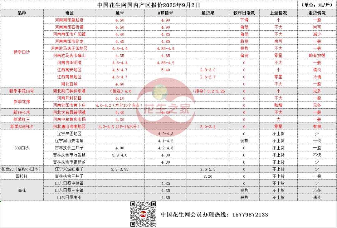 河北产区大名县普明滩新季99-1通货米收4.4左右,8个筛精选米4.8左右,花育通货米收4.0左右;唐山滦南地区新季308白沙通货米收4.2-4.3左右,水分15-16个左右,通货果3.0-3.1左右;新季花生水分不均,可供量有限,部分加工商少量外调货源,交易一般,报价大体平稳,以质论价为主;