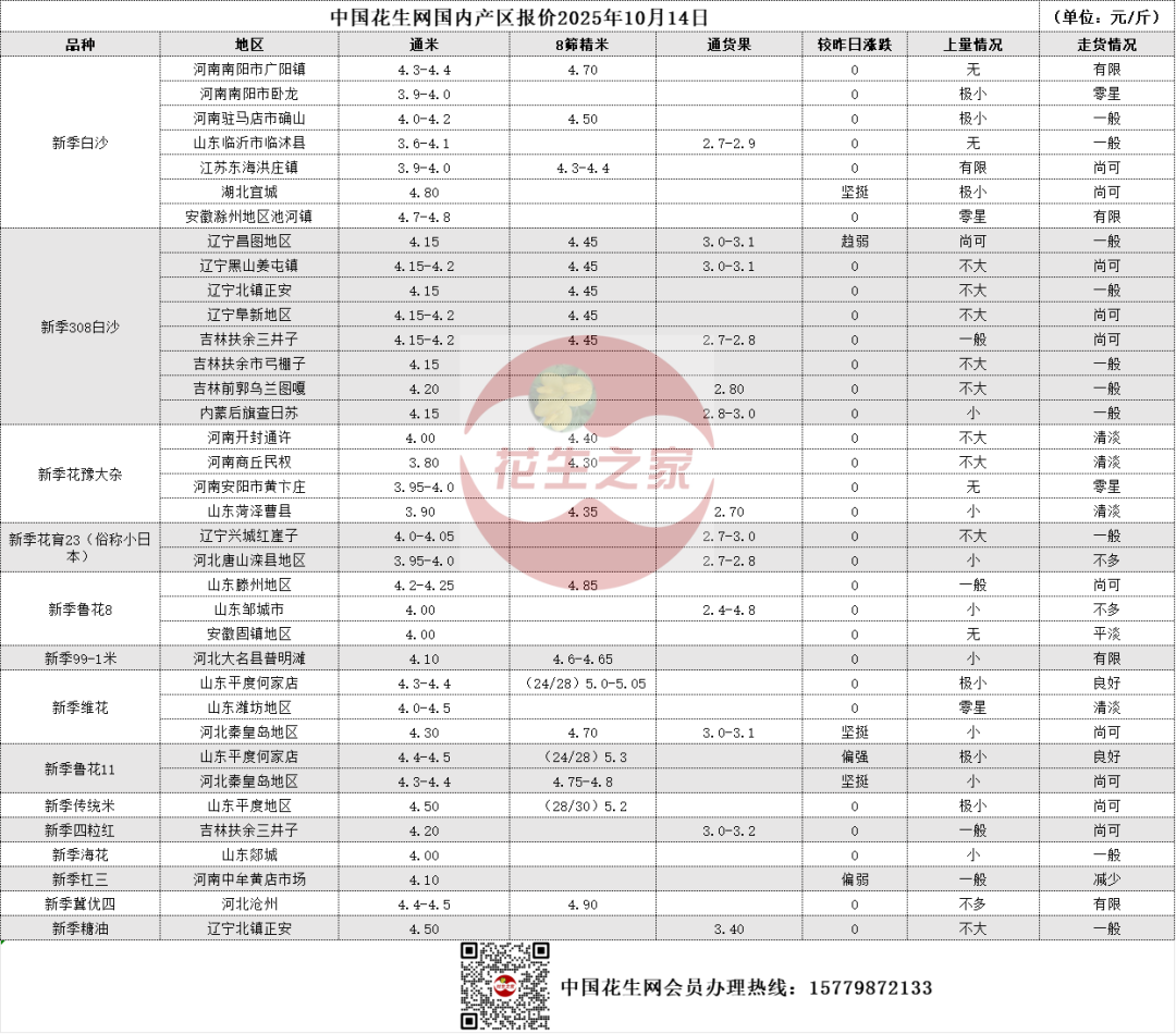 吉林产区扶余市三井子新季308白沙通果收2.7-2.8,通货米收4.15-4.2左右,8个筛上精米4.45左右,四粒红白果收3.0-3.2左右,精选果好的4.2左右,一般的3.8-4.1,打米果2.8-3.0左右,四粒红原装通货米4.2左右;前郭县乌兰图嘎新季308通果2.8左右,统米好的收4.2左右,9616统米收4.3左右,龙骨二号通果3.0左右;下雨,新花生上量放缓,采购方观望情绪升温,交易氛围一般,报价基本平稳,以水分质量定价;