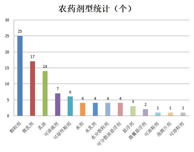 93个单剂产品中,杀虫剂72个,植物生长调节剂16个,杀菌剂2个,杀螺剂2个,杀软体动物剂1个。单剂产品涉及剂型14种,登记数量最多的剂型为颗粒剂,其次为微乳剂,乳油剂型也有较多登记,详见下图。