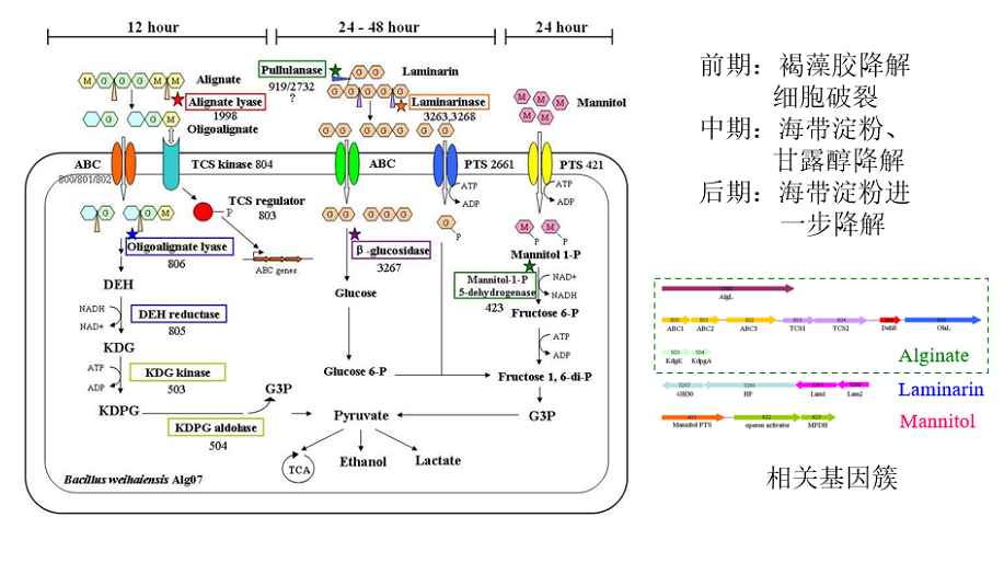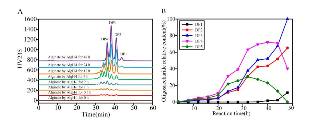 汉和生物与中科院天津工生所合作,通过研究,挖掘表征了一个新型耐碱性的双功能褐藻胶裂解酶,对褐藻胶中的多聚甘露糖醛酸(polyM)和多聚古洛糖醛酸(polyG)均具有较高活性,能够彻底降解褐藻胶,主产物为褐藻二糖、三糖和四糖,并进一步通过蛋白结构域改造,显著提高了该酶的酶活及热稳定性。