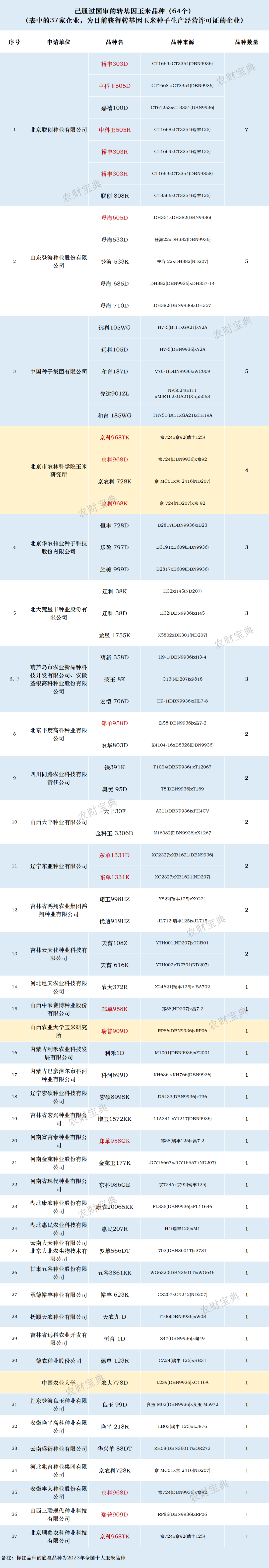 转基因、基因编辑等生物育种产业化持续提速。2024年中央一号文件提出:推动生物育种产业化扩面提速。我国转基因玉米、大豆的产业化试点自2021年开始,2023年顺利完成。2024年进入为期3年的转基因产业化示范阶段,转基因玉米种植扩大至吉林、辽宁、内蒙古、河北等8省区,推广面积约1000万亩。农财君统计发现,目前,我国已有两批次,共计64个转基因玉米、17个转基因大豆通过国家审定。其中拥有转基因玉米