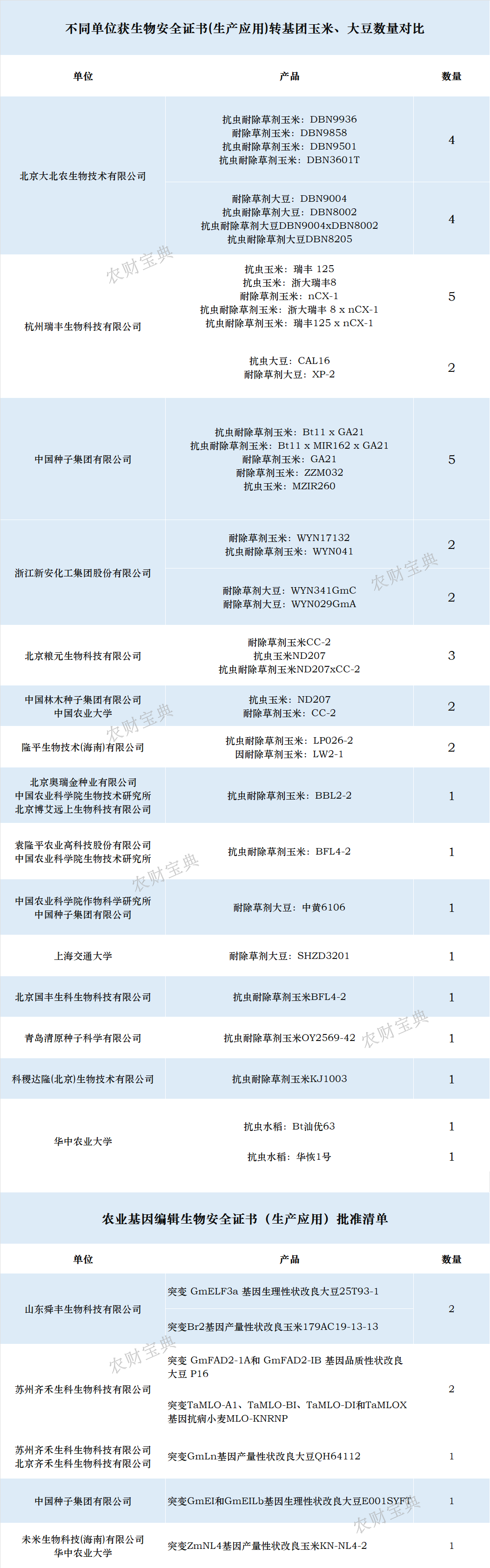转基因、基因编辑等生物育种产业化持续提速。2024年中央一号文件提出:推动生物育种产业化扩面提速。我国转基因玉米、大豆的产业化试点自2021年开始,2023年顺利完成。2024年进入为期3年的转基因产业化示范阶段,转基因玉米种植扩大至吉林、辽宁、内蒙古、河北等8省区,推广面积约1000万亩。农财君统计发现,目前,我国已有两批次,共计64个转基因玉米、17个转基因大豆通过国家审定。其中拥有转基因玉米品种数量较多的有隆平高科旗下的联创种业,登海种业,先正达旗下的中国种子集团等。北京市农林科学院玉米研究所、山西农业大学玉米研究所、中国农业大学等科研机构有转基因玉米品种通过审定。另外,据公开信息可知,目前全国范围内已获得转基因玉米种子生产经营许可证(G证)的共37家,获得转基因大豆种子生产经营许可证(G证)的有3家。中国种子集团、大北农(含旗下子公司)是少数同时拥有转基因玉米、大豆生产经营许可证的的企业。在安全证书方面,目前我国已发放多个玉米、大豆的农业转基因生物安全证书(生产应用),大北农、杭州瑞丰、中国种子集团、新安化工等企业拥有较多安全证书。其他企业也在发力,陆续获批证书取得突破。在基因编辑方面,我国也已批准发放多张安全证书,涵盖玉米、大豆、小麦等作物。与此同时,我国的生物育种产业化触角已伸至海外。例如在2024年5月,齐禾生科的基因编辑高油酸大豆P16在美国获得监管豁免。2024年6月,先正达集团宣布为全球学术研究提供优质基因编辑和育种技术的授权。大北农的“技出粮进”战略持续推进。2024年9月,大北农生物研发的一个转基因抗虫耐除草剂大豆转化事件在巴西通过安全评价审查,获批种植许可。目前。大北农至少有3个大豆性状产品在阿根廷获得种植许可,2个大豆性状产品在巴西获得种植许可。从实际情况看,我国自主研发的转基因玉米大豆在减损增产、节约成本、提升品质等方面成效明显,按照扩面提速要求正在有序扩大应用范围。据第二十一届全国种子双交会数据,2024年全国转基因玉米种子制种面积达20万亩。预计2025年种植面积将突破5000万亩,2026年开始进入“亿亩时代”,后续将越推越快。