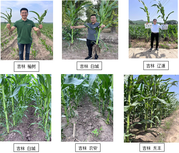 玉米前期表现:根系发达,次生根茂密,气生根生长较好,茎秆粗壮,叶片厚绿。抗旱性强,缺水高温情况下叶片卷曲缓和;根系周边,特别施肥点附近较周边区域土壤湿度更高,保水性较好。
