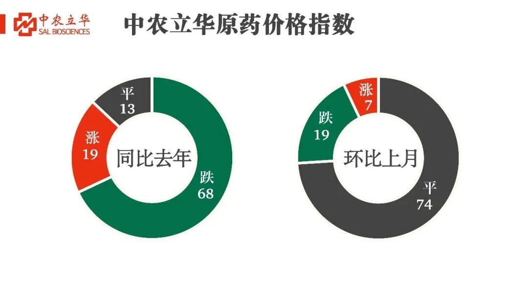 2025年10月5日,中农立华原药价格指数报74.84点,同比去年下跌0.37%,环比上月上涨0.20%。跟踪的上百个产品中,同比去年68%产品下跌;环比上月74%产品持平,7%产品上涨。