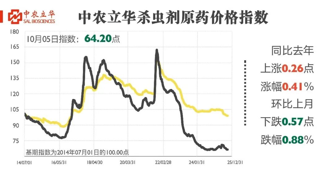 2025年10月5日,中农立华杀虫剂原药价格指数报64.2点,同比去年上涨0.41%,环比上月下跌0.88%。