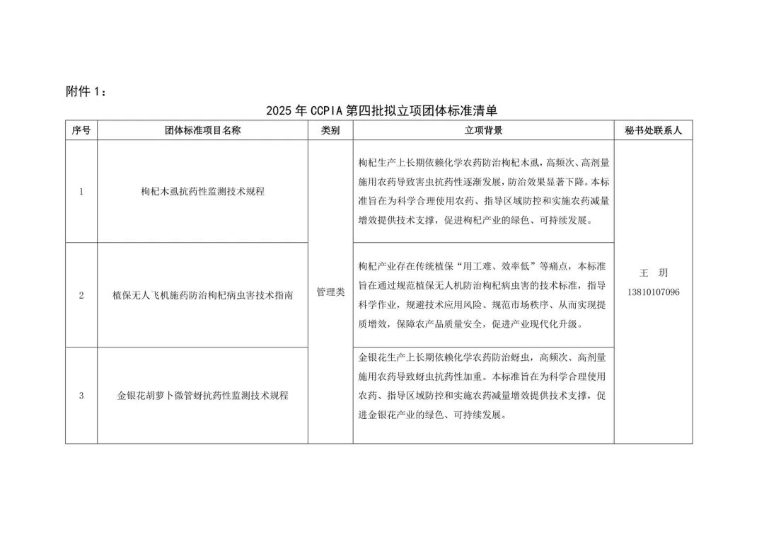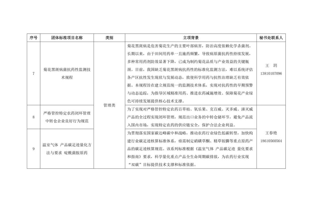 各相关单位:根据《中国农药工业协会团体标准管理办法》,现对《枸杞木虱抗药性监测技术规程》等9项团体标准进行立项公示,公示截止时间为2025年10月31日。如有异议,请于公示期内予以书面反馈并将反馈意见发至电子邮箱:ccpia_ttbz@163.com。CCPIA标委会秘书处联系人:王 玥:13810107096王春艳:18610560564毕 超:1