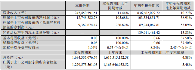 公司2025年前三季度实现营业收入8.37亿元,同比增长10.77%;实现归属于上市公司股东的净利润1.03亿元,同比增长38.91%;基本每股收益0.66元。其中,第三季度实现归属于上市公司股东的净利润1274.64万元,同比增长105.68%。