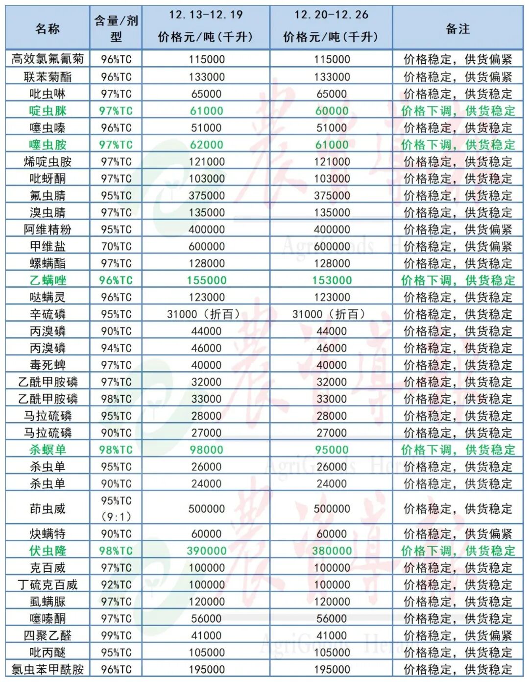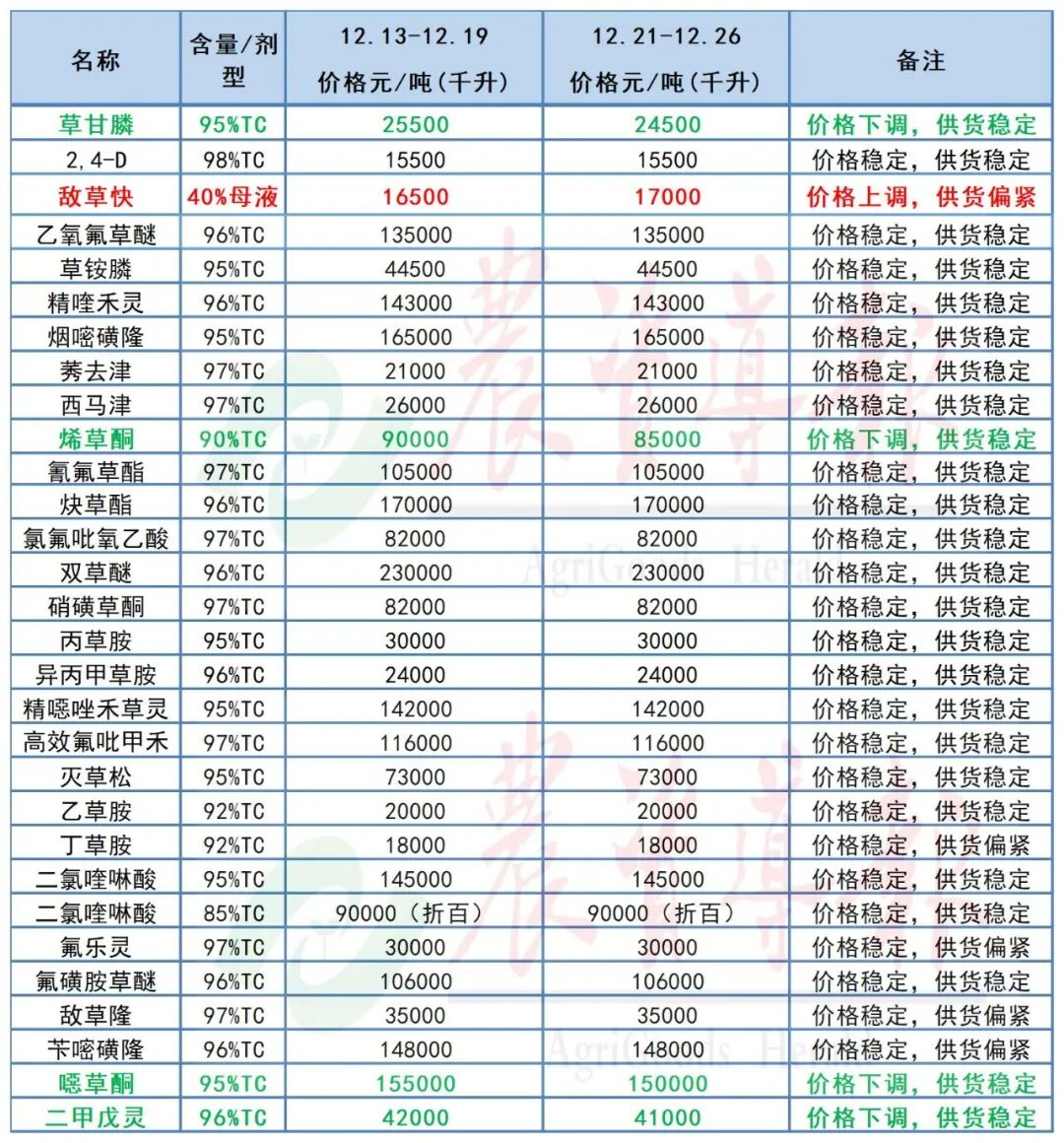 敌草快价格上涨!草甘膦、烯草酮、啶虫脒、吡唑醚菌酯、啶酰菌胺等12个原药价格下跌!