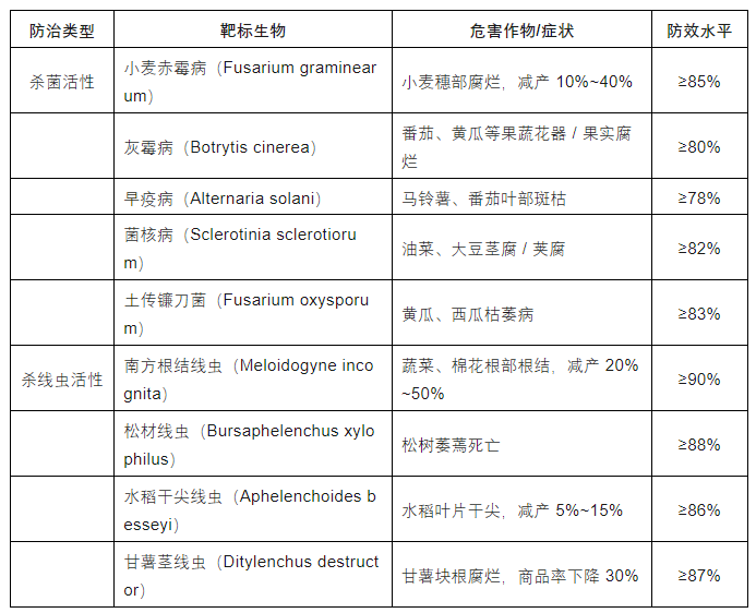 杀线虫活性:针对南方根结线虫(Meloidogyne incognita)、松材线虫(Bursaphelenchus xylophilus)等靶标线虫,有效作用浓度为 0.04~0.2 ppm(即 0.04~0.2 mg/L),72 小时校正死亡率≥85%,显著低于常规杀线虫剂(如噻唑膦推荐浓度 1~5 ppm),对土壤微生物群落影响极小;