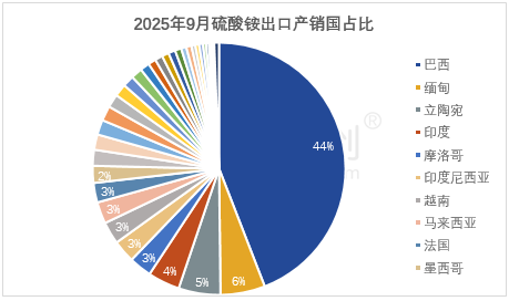 9月,硫酸铵主要出口目的地依然是巴西及东南亚几国,其中巴西以99.37万吨位居首位,而对缅甸出口12.84万吨,排名第二,对立陶宛出口量为12.08万吨,排名第三,对东南亚其他几国出口量均在10万吨及以下,其中对印度出口量9.21万吨,排名第四,对摩洛哥出口6.52万吨,排名第五,对印度尼西亚出口6.5万吨,排名第六,对越南出口6.44万吨,排名第七。