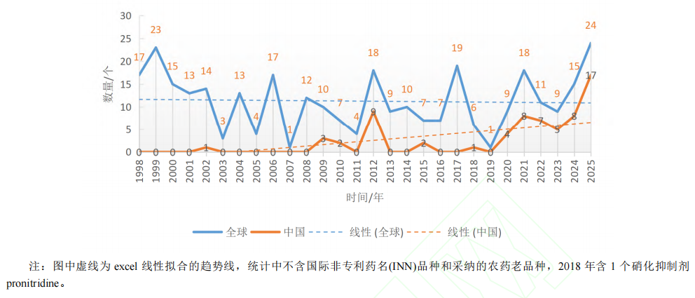 图26 1998—2025年ISO公布的农药新品种数量及其趋势