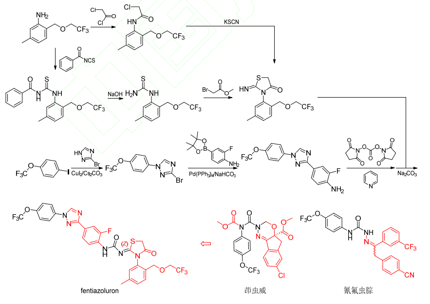 Fentiazoluron是由科迪华农科公司创制的含三唑和噻唑酮骨架结构的双缩脲类新型杀虫剂,对鳞翅目害虫具有较高生物活性。在化学骨架结构上,fentiazoluron与茚虫威和氰氟虫腙等缩氨基脲类杀虫剂存在一定的相似性。根据不同测试方式的生测结果可以确定fentiazoluron具有较好的胃毒和触杀作用,尚不清楚其是否具有内吸传导和渗透作用;而根据与多种杀菌剂和其他杀虫剂混用具有协同增效作用推测,fentiazoluron可能具有全新的作用机制。室内生测结果表明,fentiazoluron 50μg/cm2饲喂处理对甜菜夜蛾(Spodoptera exigua)和甘蓝尺蠖(Trichoplusia ni)的5~7 d杀死率≥50%,200 mg/L喷雾处理桃蚜若虫和无翅成虫的3 d杀死率<80%。Fentiazoluron可能的创制思路和合成路线见图4。