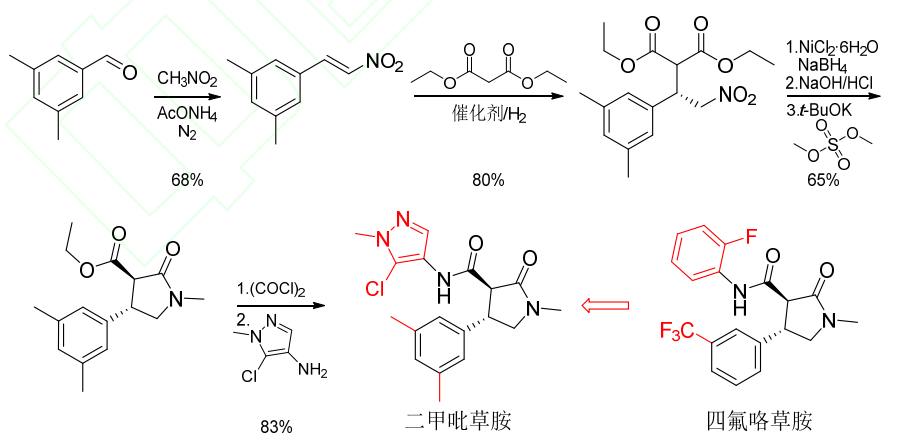 二甲吡草胺是青岛清原化合物公司创制的具有杀菌作用的新型除草剂,可视为对四氟咯草胺(tetflupyrolimet)的2个苯环同时进行修饰得到。推测该除草剂的作用机制与四氟咯草胺类同,为二氢乳清酸脱氢酶(DHODH)抑制剂。据报道,二甲吡草胺主要用作水稻田封闭除草剂,具有适用性广(适用于多种耕作方式)和持效期长等优点。室内生测普筛结果表明,二甲吡草胺120 g/hm2苗前封闭处理稗草、稻稗、马唐和千金子的防效达100%(15 d),同时对淮稻安全、对稻稗的除草活性优于同剂量的外消旋体;二甲吡草胺400 mg/L处理水稻纹枯病和苹果轮纹病的防效分别为66%、55%(4 d)。同时,二甲吡草胺与多种选择性和非选择性除草剂混用对靶标杂草防控均具有不同程度的增效作用。二甲吡草胺的可能的创制思路和合成路线见图19,合成可共用四氟咯草胺的中间体。