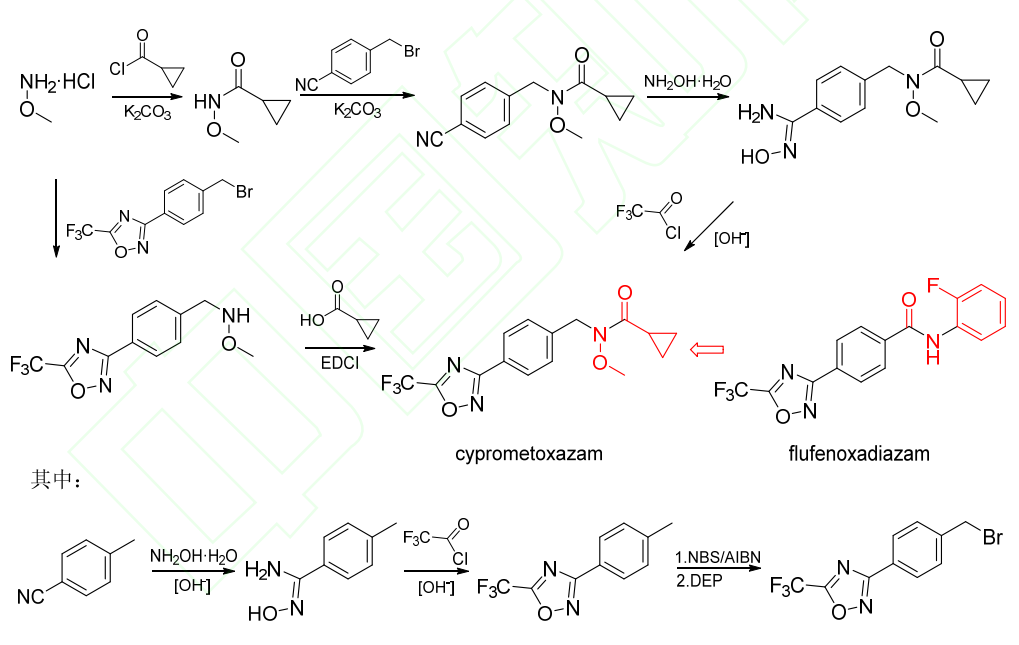 Cyprometoxazam是继flufenoxadiazam后ISO批准的第2个三氟甲基噁二唑类杀菌剂,可视为对flufenoxadiazam的甲酰胺支链部分进行修饰而来。推测cyprometoxazam的作用机制与flufenoxadiazam类同,为Ⅱ类选择性组蛋白去乙酰化酶(HDAC)抑制剂。研究结果表明,cyprometoxazam 200 mg/L对小麦叶锈病(Puccinia recondita f.sp.tritici)的7~9 d预防和6~8 d治疗的防效均≥80%,对亚洲大豆锈病(Phakopsora pachyrhizi)12~14 d预防的防效≥80%,对黄瓜炭疽病(Colletotrichum lagenarium)3~4 d预防的防效≥80%,同时与苯并烯氟菌唑(benzovindiflupyr)、氟唑菌酰胺、氟唑菌酰羟胺、吡噻菌胺、苯醚甲环唑、环丙唑醇、戊唑醇、己唑醇、丙硫菌唑、嘧菌酯、肟菌酯、啶氧菌酯、吡唑醚菌酯、精甲霜灵、苯锈啶、丁苯吗啉、嘧菌环胺、咯菌腈、螺环菌胺、代森锰锌、百菌清、环酰菌胺、咪鲜胺、氟噻唑吡乙酮、双炔酰菌胺、氟啶胺、三乙膦酸铝、抗倒酯、活化酯、草甘膦、2,4-滴和噻虫嗪等农药按一定比例混用对亚洲大豆锈病、葡萄白粉病、黄瓜炭疽病和小麦叶锈病预防具有协同增效作用。Cyprometoxazam的熔点38~41℃,可能的创制思路和合成路线见图12,合成可共用flufenoxadiazam的关键中间体。