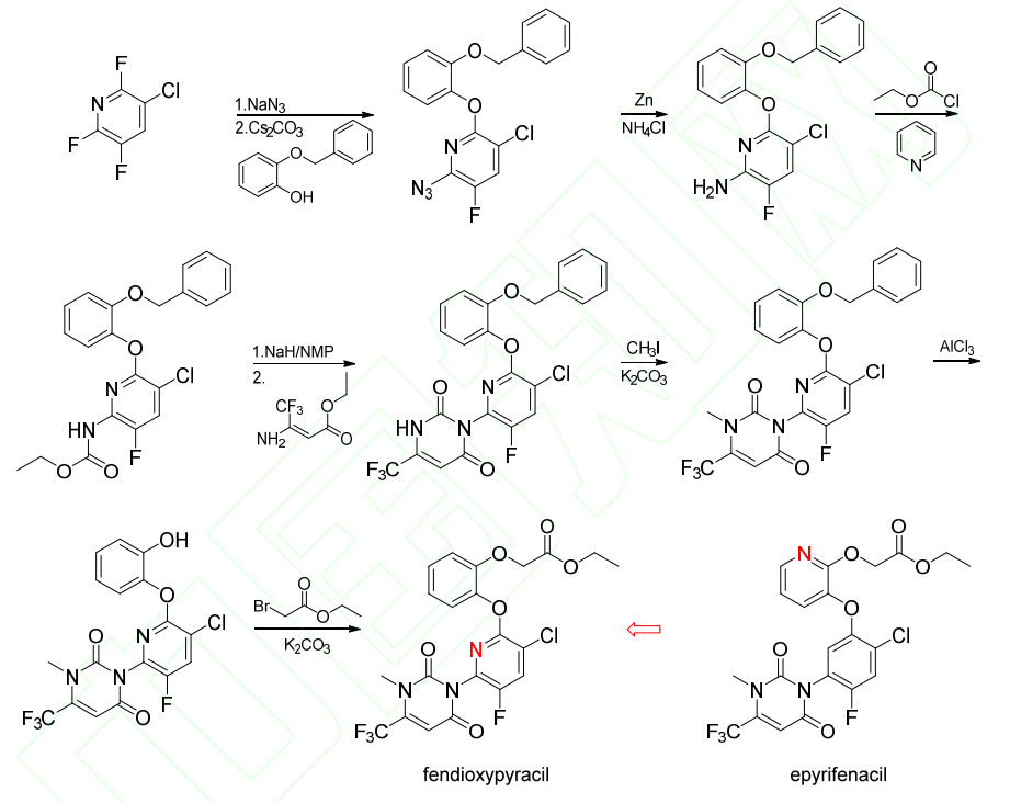 Fendioxypyracil和氟丙草嗪属于N-芳基酰亚胺类新型除草剂。Fendioxypyracil由巴斯夫欧洲公司开发,可视为将epyrifenacil中的苯环和吡啶环位置互换得到。推测fendioxypyracil的作用机制与epyrifenacil类同,为原卟啉原氧化酶(PPO)抑制剂。室内生测结果表明,fendioxypyracil 16 g/hm2苗前处理对反枝苋(Amaranthus retroflexus)、藜(Chenopodium album)、稗草(Echinocloa crus-galli)和狗尾草(Setaria viridis)的防效≥85%(14~28 d),2~4 g/hm2苗前处理对苋属杂草Amaranthus tamariscinus敏感种群和含△G210突变的原卟啉原氧化酶抑制剂类抗性1和2型种群的防效达87%~100%(14~28 d)。Fendioxypyracil对Amaranthus tamariscinus杂草敏感种群的防效不高于抗性种群或与之相当但都优于唑啶草酮(azafenidin),同时对原卟啉原氧化酶中Arg128Met、Arg128Gly、Arg128His、Arg128Ile、Arg128Lys和Gly399Ala单位点或多位点突变的杂草也有效,说明其对原卟啉原氧化酶的作用方式可能与现有的除草剂不同。巴斯夫欧洲公司等开发了fendioxypyracil与精草铵膦、草甘膦或2,4-滴等除草剂混用产品并申请了多个专利。Fendioxypyracil可能的创制思路和合成路线见图20,合成可共用epyrifenacil的中间体。