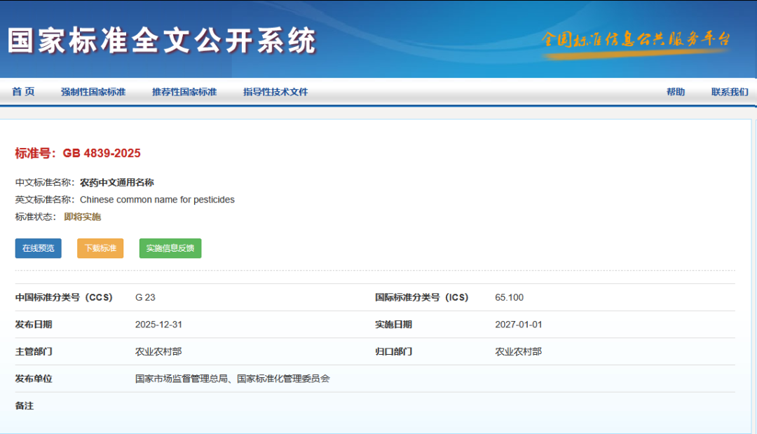 《农药中文通用名称》国家标准修订版于2025年12月31日发布,将自2027年1月1日起实施。该标准是涉及农药监管与使用的强制性国家标准。主要内容:本标准规定了937个农药的中文通用名称,包括891个农药中文通用名称(除微生物类)和46个微生物类农药品种,对GB4839-2009中的1274个通用名称进行修订和完善,对未取得正式登记的中文通用名称进行删除,对存在的错误进行更正。新修订的农药中文通用