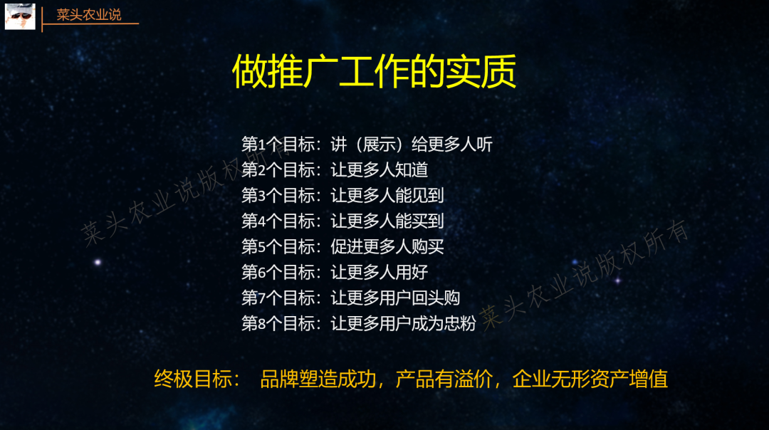 无论是推广农资产品还是农技知识,推广的目的是为了让更多人知道、见到、用到所推广的产品和技术,因此,推广工作的实质就是传播,销售推广人员其实就是产品和技术的传播员。推广工作的逻辑很简单:第1个目标:讲(展示)给更多人听第2个目标:让更多人知道第3个目标:让更多人能见到第4个目标:让更多人能买到第5个目标:促进更多人购买第6个目标:让更多人用好第7个目标:让更多用户回头购第8个目标:让更多用户成为忠实