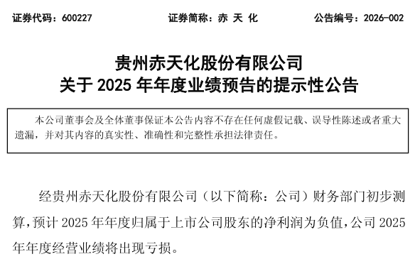 2026年1月12日晚,赤天化发布公告称,经公司财务部门初步测算,预计2025年年度归属净利润为负值,公司2025年年度经营业绩将出现亏损。