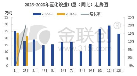 具体来看,2026年2月,氯化铵的出口量就达到了21.51万吨,展现出强劲的增长动力。与2025年同期相比,2026年初的这两个月里,氯化铵的出口量继续保持增长态势,成功延续了2025年出口量大幅攀升的良好势头(2025年1-2月份氯化铵出口量为42.82万吨)。这一显著增长,主要得益于国内氯化铵产能的持续扩张,使得供应能力大幅提升;同时,国际市场对氯化铵作为优质氮肥原料的认可度也在不断提高,特别是在东南亚、南亚等农业主产区,对氯化铵的需求尤为旺盛,为出口增长提供了有力支撑。