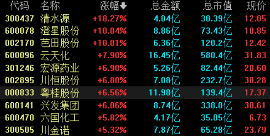 11月6日,磷化工板块盘中异动,芭田股份、澄星股份涨停,清水源触及涨停,云天化涨7%,兴发集团、川恒股份等涨6%,六国化工、云图控股等个股集体走强。