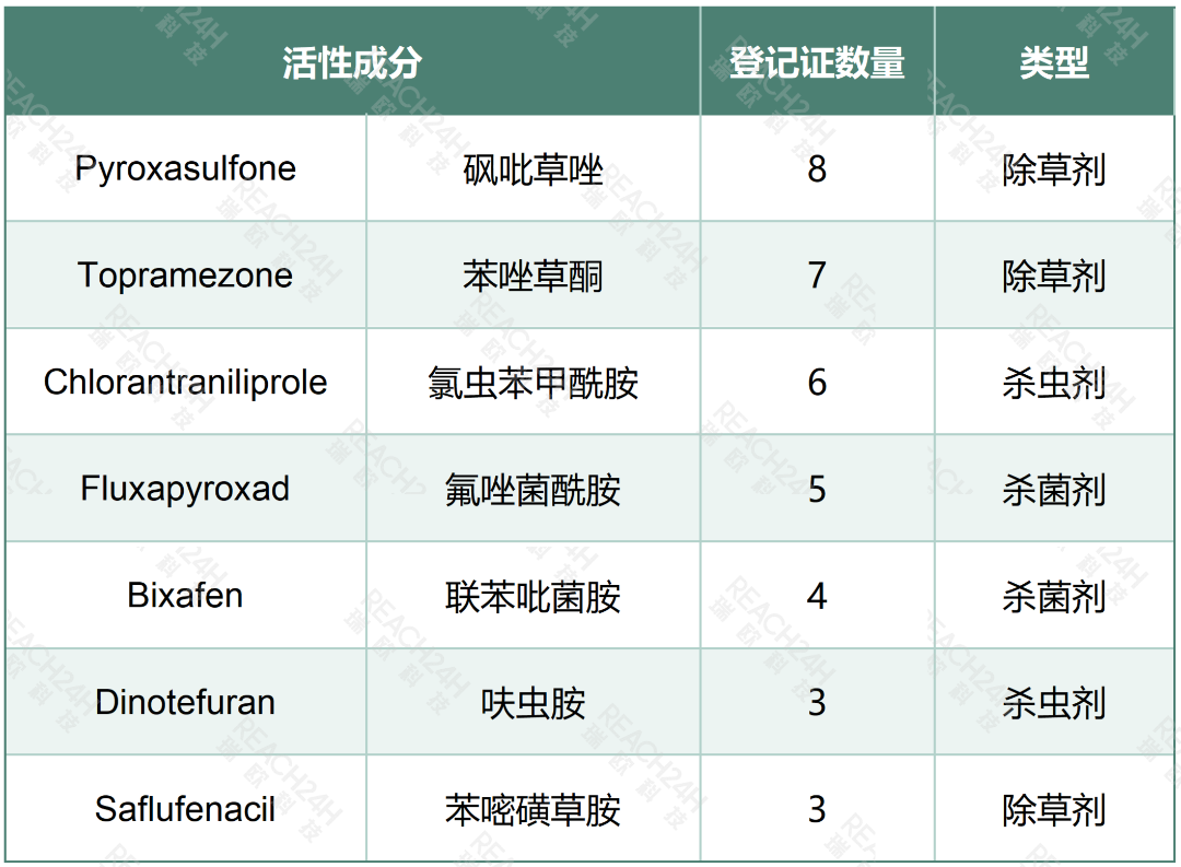 前7种高频获批的活性物质(砜吡草唑、苯唑草酮、氯虫苯甲酰胺等)占总量的27.5%,且均为近年专利到期的新型高效成分。除草剂在头部占比过半,这与澳大利亚免耕农业体系下,小麦、棉花等大田作物的抗性草害防治需求高度契合。