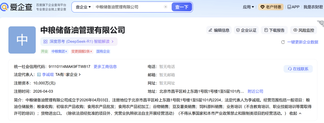 企查查APP显示,近日,中粮储备油管理有限公司、中粮储备粮管理有限公司成立,注册资本均为1亿元,经营范围包括粮油仓储服务、粮食收购、初级农产品收购等。