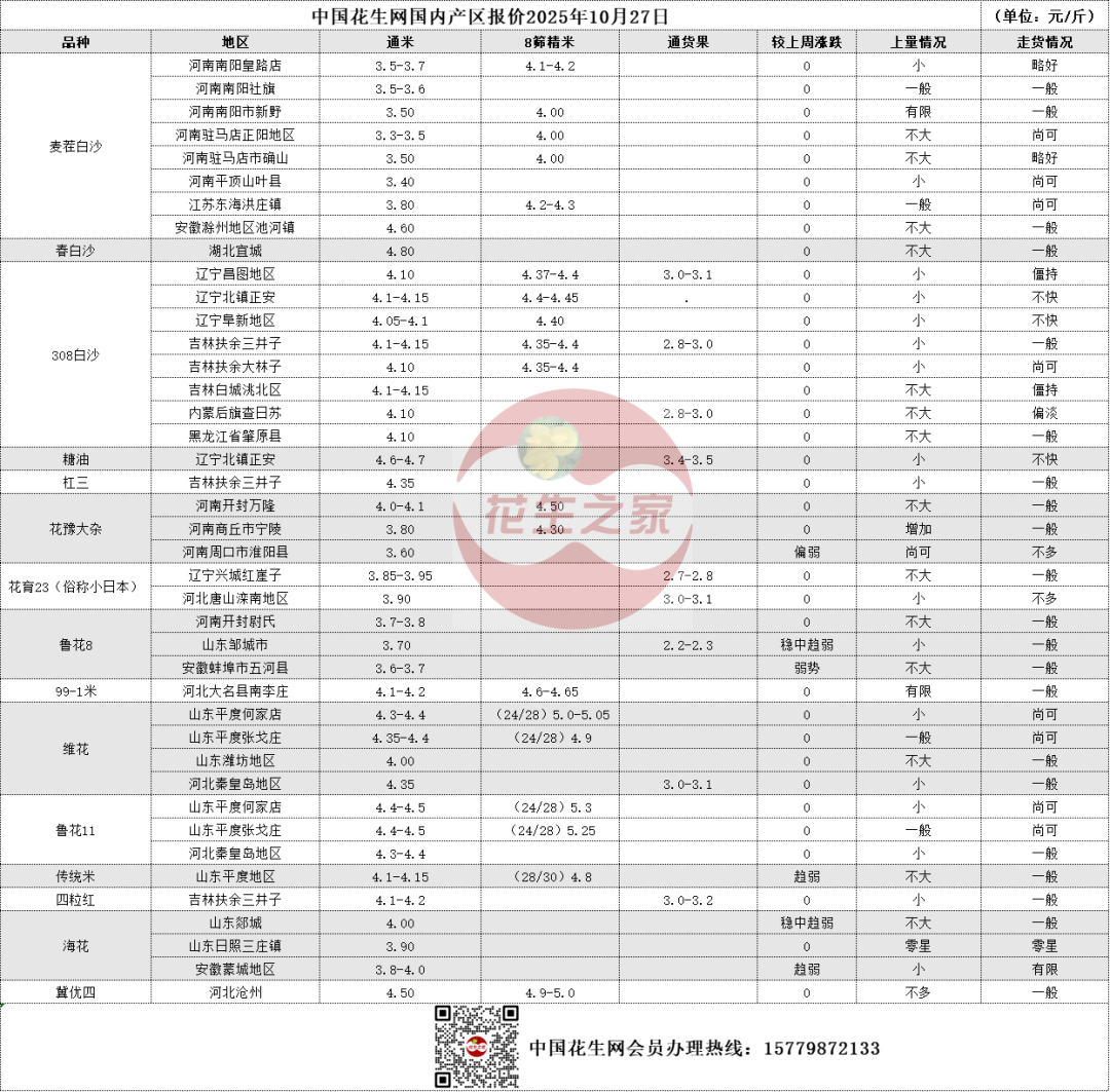 辽宁产区昌图县付家镇308白沙通货米收4.1左右,8个筛精选米4.37-4.4左右,通货果3.0-3.1左右,色选果3.8左右;北镇正安地区308白沙通货米收4.1-4.15左右,8个筛精选米4.4-4.45左右,瓣米4.1-4.2左右,糖油通米收4.6-4.7左右;城红崖子花育23(俗称小日本)通货米主流价收3.85-3.95左右,打米果2.7-2.8左右;购销僵持状态明显,一方面、老百姓低价不认卖,上货量小,另外、需求方压价采购,交易有限,价格趋稳调整,以质论价;
