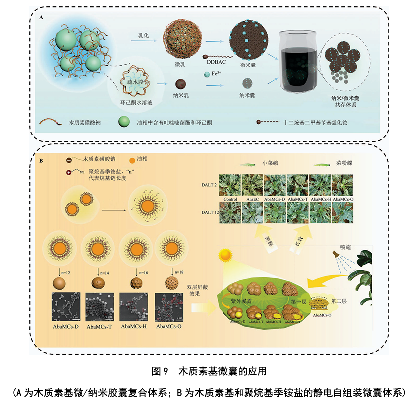 木质素及其衍生物因来源广泛、成本低廉且具备抗光解特性,也成为农药微囊的重要壁材。利用界面聚合制备的木质素基吡唑醚菌酯微囊在保持高包封率的同时显著降低了水生毒性,并在田间试验中展现了优异的防治效果。进一步研究发现,将柔性骨架与木质素颗粒复合可赋予囊壁优良的柔韧性和抗光解性,提升叶面滞留率与抗冲刷性,从而显著改善病害防治效果与作物产量。同时,一步法构建的木质素基微/纳米胶囊复合体系能够通过比例调控实现精准释放,在辣椒病害防治中表现出较高防效(图9A)。此外,基于木质素磺酸钠与聚烷基季铵盐的静电自组装微囊,通过调控壳体松散程度实现了快速释放与紫外防护的平衡,在田间害虫防控中表现出双重优势(图9B)。