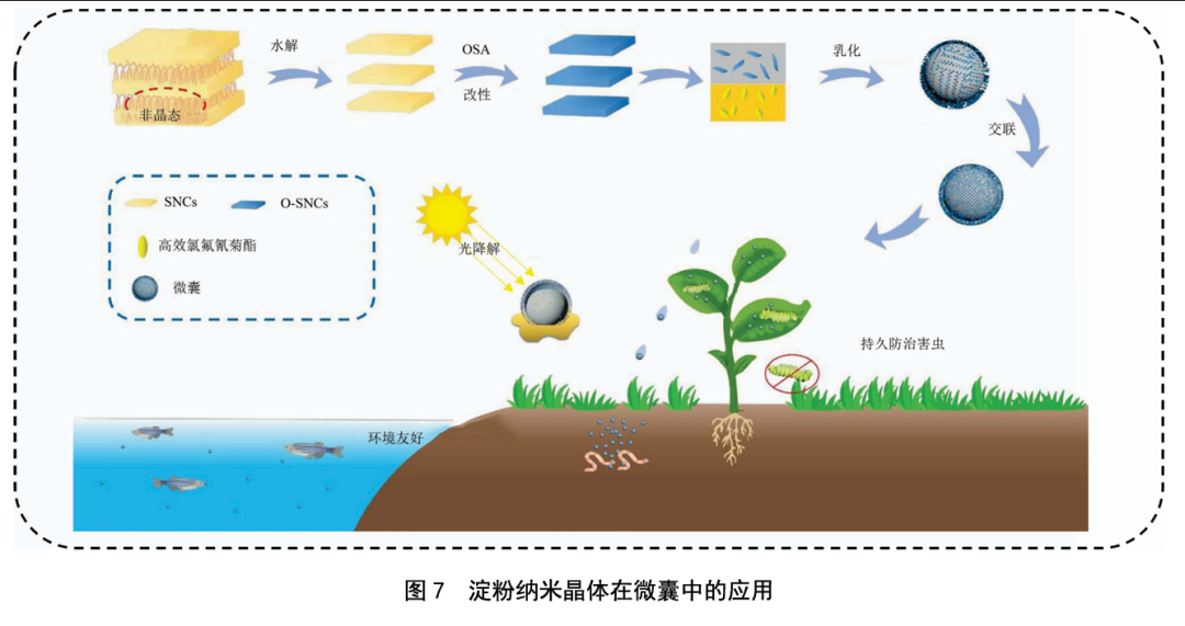在多糖类材料中,淀粉纳米晶体(SNC)、纤维素纳米晶体(CNC)及几丁质纳米晶体(ChNC)被广泛用于农药微囊的构建。Chen等研究表明,利用磺化纤维素纳米晶体稳定高效氯氟氰菊酯熔融并通过界面聚合制得的微囊,具有极高的包封率(99.29%),不仅延长了害虫防治持效期,还降低了对斑马鱼的毒性与皮肤刺激,同时在14d内能够显著降解,减少了农药残留。类似地,采用ChNC构建的Pickering乳液模板可实现无表面活性剂的农药微囊化,不仅具备高负载量(78.7%)和酶促响应释放特性,还因正电荷作用增强了叶面附着力,显著延长了农药药效并降低了非靶标生物毒性(图6)。此外,以CNC稳定的Pickering乳液为模板制备的缓释微囊在盐离子作用下实现乳液稳定化,表现出高包封率(96.76%)和长效释放能力(>82h),为吡虫啉等农药的高效缓释提供了新思路。在淀粉体系中,辛烯基琥珀酸酐改性的SNC作为乳化剂同样展现出优异性能,制得的微囊不仅储存稳定性好,而且能有效降低对斑马鱼和蚯蚓的急性毒性,同时保持长期害虫防治效果(图7)。