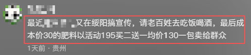 贵州网友说:最近这帮人在他们那边活动请老百姓吃饭喝酒,最后将成本价30的肥料以均价130一包卖给种植户。