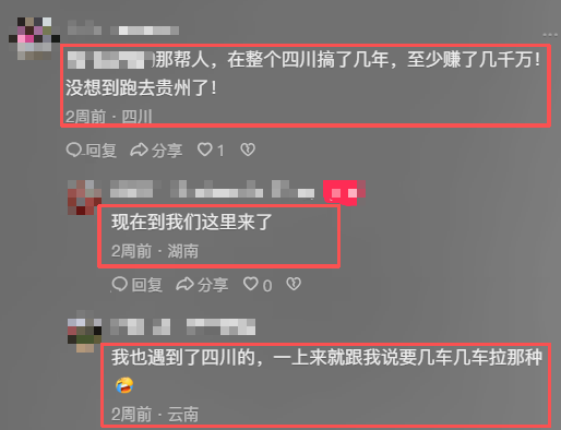 有四川网友看到后说这帮人已经在四川搞了几年至少赚了几千万。而湖南和云南的网友说他们也遇到了相同的团伙。