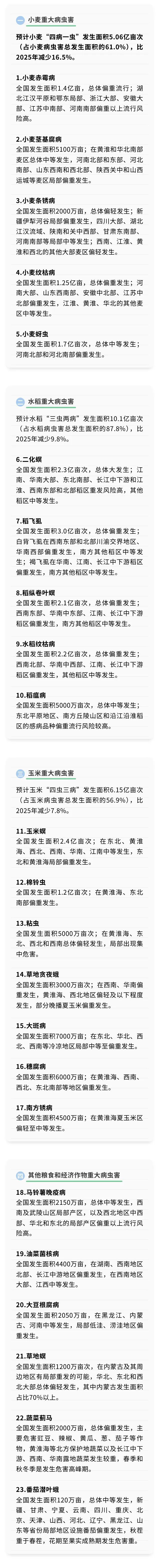 1月5日,全国农技推广中心发布2026年全国农作物重大病虫害发生趋势预报。预计2026年小麦、水稻、玉米、马铃薯等主要粮食作物和油料、蔬菜作物上23种重大病虫害呈重发态势,全国预计发生面积22.50亿亩次,比2025年减少10.6%。详细信息如下: