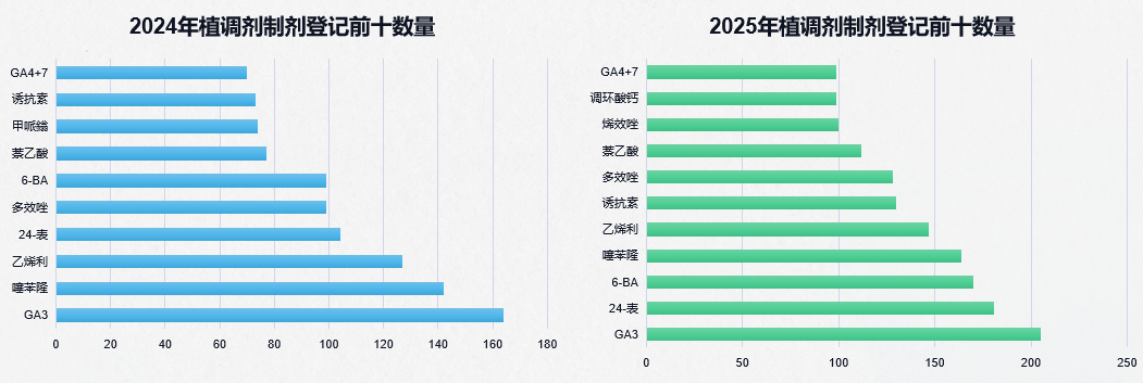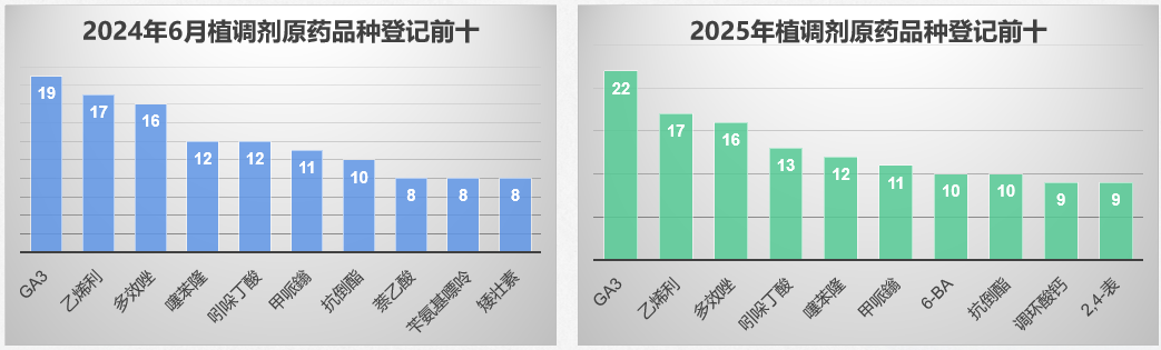 截止到2024年6月原药登记前十中生物调节剂占3个席位,到了2025年占了4个席位。