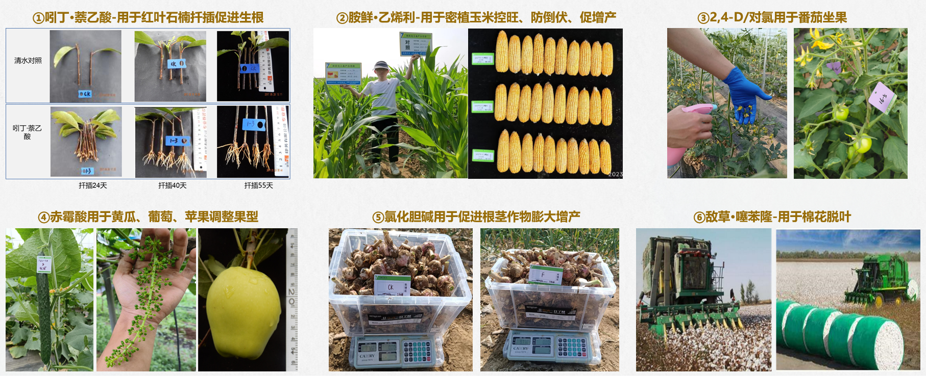 如吲丁·萘乙酸促红叶石楠生根、胺鲜·乙烯利防玉米倒伏、赤霉酸调整果蔬果型;2,4-D/对氯用于番茄坐果;赤霉酸用于黄瓜、葡萄、苹果调整果型等。