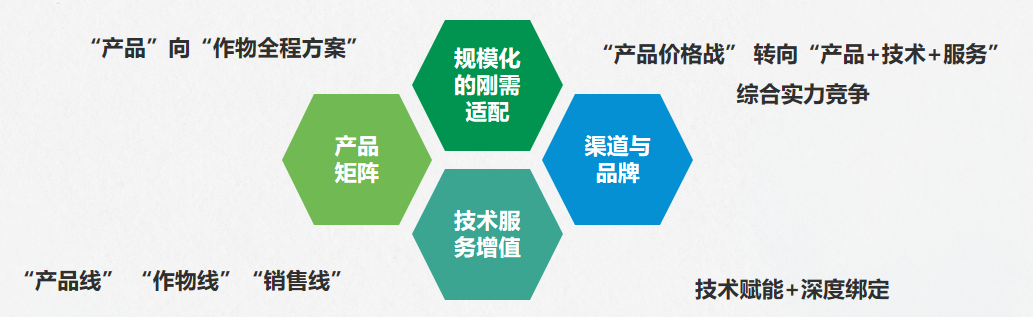 服务模式从“产品”转向“作物全程方案”,竞争核心变为“产品+技术+服务”,注重技术赋能与深度绑定。