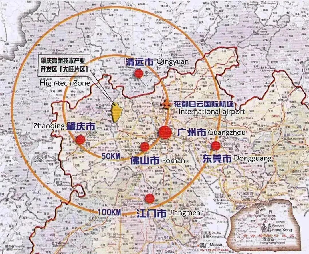 “ 企业区位 肇庆高新区位于珠三角工业中心,距广州市区80公里,与佛山一河之隔。从本区到广州白云机场仅需40多分钟车程,到香港、澳门仅需2个多小时车程,目前已经开通高铁站、轻轨站、火车站、码头、多条高速公路等交通实施。