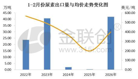 据海关数据统计显示:2026年1-2月份中国尿素出口总量约为41.94万吨,出口总量较去年同期增加41.54万吨,同比上涨10385.00%;1-2月份出口均价为398美元/吨,较去年同期均价高200美元/吨。分月来看,2026年1月份中国尿素出口量为30.79万吨,出口金额共计12237万美元,出口量环比增加10.64%,同比上涨11742.31%。2026年2月份中国尿素出口量为11.15万吨,出口金额共计4443万美元,出口量环比下降63.79%,同比上涨7864.29%。