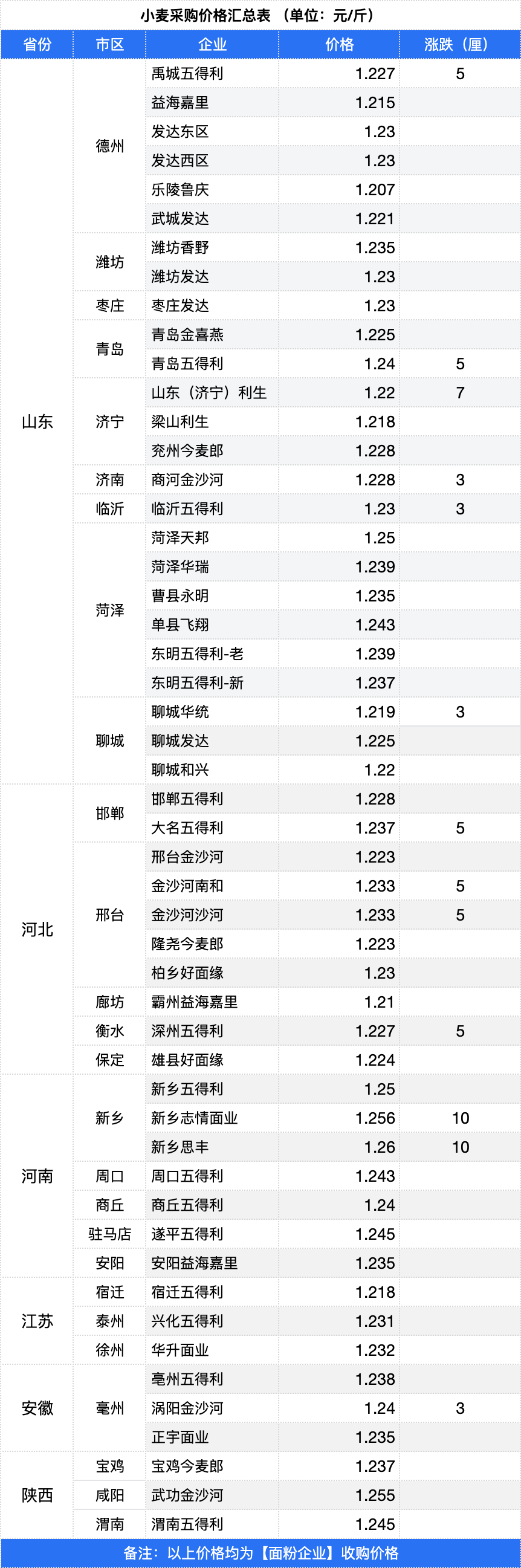 小麦价格快讯今日企业采购调价山东济南金沙河,1.228元,↑3 厘禹城五得利,1.227元,↑5 厘华统面业,1.219元,↑3 厘青岛五得利,1.240元,↑5 厘济宁利生,1.220元,↑7 厘河北深州五得利,1.227元,↑5 厘大名五得利,1.237元,↑5 厘隆尧今麦郎,1.233元,↑5 厘河南延津克明,1.240元,↑2 厘安徽涡阳金沙河,1.240元,↑3 厘价格汇总10月10日面