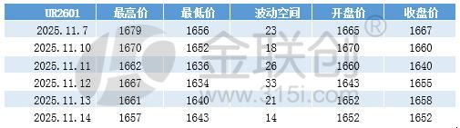 上周五,受第四批尿素出口配额下发提振,尿素主力合约UR2601价格出现上涨。周二情绪略有下降,收盘价出现小幅回落。然市场消息面此起彼伏,盘面受此影响,出现区间震荡。周内最低至1634元/吨,最高价在1679元/吨。整体波动空间处于14-33元/吨。
