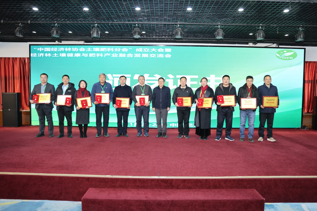 1月23—24日,中国经济林协会土壤肥料分会在北京正式成立。成立大会由中国经济林协会主办,中国经济林协会土壤肥料分会承办,清华大学无锡应用技术研究院、中国农业科学院农业资源与农业区划研究所、山东鲁天自动化设备有限公司、宁夏荣和绿色科技有限公司等单位协办,来自全国63家科研院所和企业的120余名代表参加了成立大会。同期,经济林土壤健康与肥料产业融合发展交流会顺利举办。成立大会由中国经济林协会副会长宋慧刚主持并宣读分会批复文件,中国经济林协会会长金旻正式为土壤肥料分会授牌。会议推选清华大学无锡应用技术研究院担任分会会长单位,盖国胜研究员担任分会第一届分会理事会会长,中国农业科学院农业资源与农业区划研究所张仙梅副研究员担任秘书长,清华大学深圳研究生院夏广志、塔里木大学支金虎、中国林业科学研究院兰再平等10名同志担任分会第一届理事会副会长。全国农业技术推广服务中心高祥照研究员担任分会首席专家、中国林业科学研究院乌云塔娜研究员担任分会专家委员会主任。在我国经济林产业快速发展的当下,土壤肥料分会的成立填补了专业领域的组织空白,同时也向行业释放出重要信号:我国经济林产业将开启土壤肥料领域的新篇章,为肥料行业提供了新的战场。中国经济林协会会长金旻为分会会长和副会长单位颁发铭牌和聘书中国经济林协会土壤肥料分会会长盖国胜为常务理事单位颁发铭牌和聘书经济林,已成为继粮食、蔬菜后第三大重要农产品。记者在会上了解到,全球80亿人口中,以经济林为重要营养来源的已超过10亿,占1/8。发展经济林产业是我国国家战略需求,习近平总书记多次强调“要树立大食物观,森林是粮库,要向森林要食物”。木本粮食与草本主粮营养互补,且不与主粮争地,具有重要的优势。目前,我国经济林种植面积已突破7亿亩,生产的森林食物年产量超2亿吨,且每年新造、改造经济林面积近3000万亩,带来巨大的产业机遇。不过,经济林土壤和施肥问题十分突出。我国经济林主产区土壤有机质含量平均不足1.5%,全国约40%经济林地出现酸化现象,缺乏水肥管理的面积高达87.5%,因土壤问题导致的减产幅度达10%~30%,优果率落后发达国家15~20个百分点。“在经济林从‘规模扩张’转向‘内涵发展’的关键期,土壤肥料分会的成立恰逢其时!”金旻指出,土壤肥料分会的成立将搭建“政产学研用”协同创新的桥梁,更将成为破解产业瓶颈、守护生态底色的重要力量。针对土壤肥料分会的未来工作,金旻提出四点希望:第一,做科技创新的“领航者”。聚焦耕地地力提升,绿色经济林木肥料开发,盐碱地、酸化土壤改良,东北黑土地保护等核心领域,组织联合攻关,推广秸秆还田、测土配方施肥等绿色技术,让“科技芯片”赋能产业升级。第二,做产学研融合的“连接器”。既要推动科研院校与企业的成果转化,更要把技术送到田间地头,让农民会用、敢用,受益于科学施肥技术,打通“最后一公里”。第三,做行业规范的“守护者”。牵头制定土壤肥料领域的行业、团体标准,引导企业诚信经营,推广绿色低碳生产方式,让“生态优先”成为产业共识。第四,做政策落地的“助推器”。深入调研产业痛点,为政府决策提供参考,推动政策红利精准落地,让经营主体有更多获得感。盖国胜在会上表态,未来土壤肥料分会将深入回应经济林产业的期待,做好土壤健康和肥料投入品的研发、行业标准引领等系列工作,促进经济林行业高质量发展。中国经济林协会土壤肥料分会会长、清华大学无锡应用技术研究院粉体工程中心主任盖国胜
