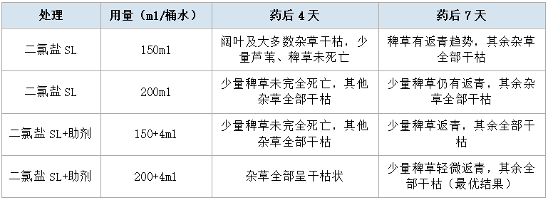 试验结果表明,敌草快二氯盐对阔叶杂草及大多数禾本科杂草防效优异,150ml/桶水剂量下绝大多数杂草4天内干枯;提高至200ml并配合助剂使用时,对芦苇、大龄狗尾草、低龄马唐等难治杂草的防效进一步提升,整体表现达到最优。对刚抽穗稗草的防效相对较弱,提高用量可显著改善,实际使用中建议适当加量或配合助剂施用。