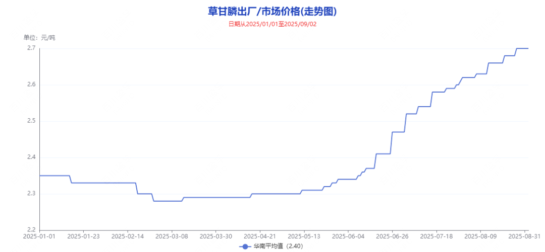突然上涨!旺季到来,原料大涨5000元/吨!经历三年低迷期,草甘膦市场终于迎来转机!笔者发现,近期草甘膦价格从2.2万元/吨涨至2.7万元/吨,涨幅近23%!来源*:百川百川数据显示,截止9月2日,草甘膦市场均价为2.7万元/吨,继7月突破2.5万元/吨后仅2个月时间价格再涨2000元/吨,达到2.7万元/吨高位。作为全球第一大除草剂,可以说草甘膦在经历长达三年的价格低谷后,2025年开启了强势复