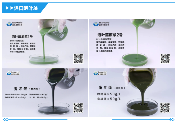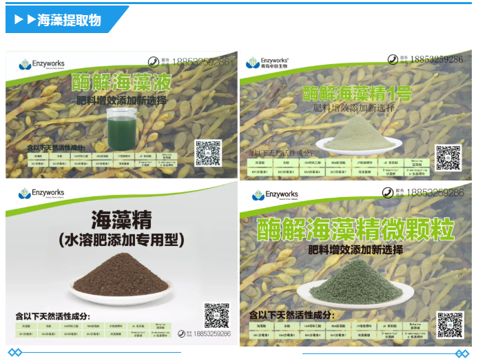 以食品级海带、马尾藻为原料,采用定向靶标酶制剂在低温条件下进行酶解反应,获取的高活性天然海藻提取物。混配性好,用途广泛,可用于肥料增效或直接应用于作物营养。原料品质优良,内源活性物质含量高,从源头保障海藻提取物品质;酶制剂酶活高,稳定性强,产品收率高,最大限度保留海藻提取物的种类与活性。